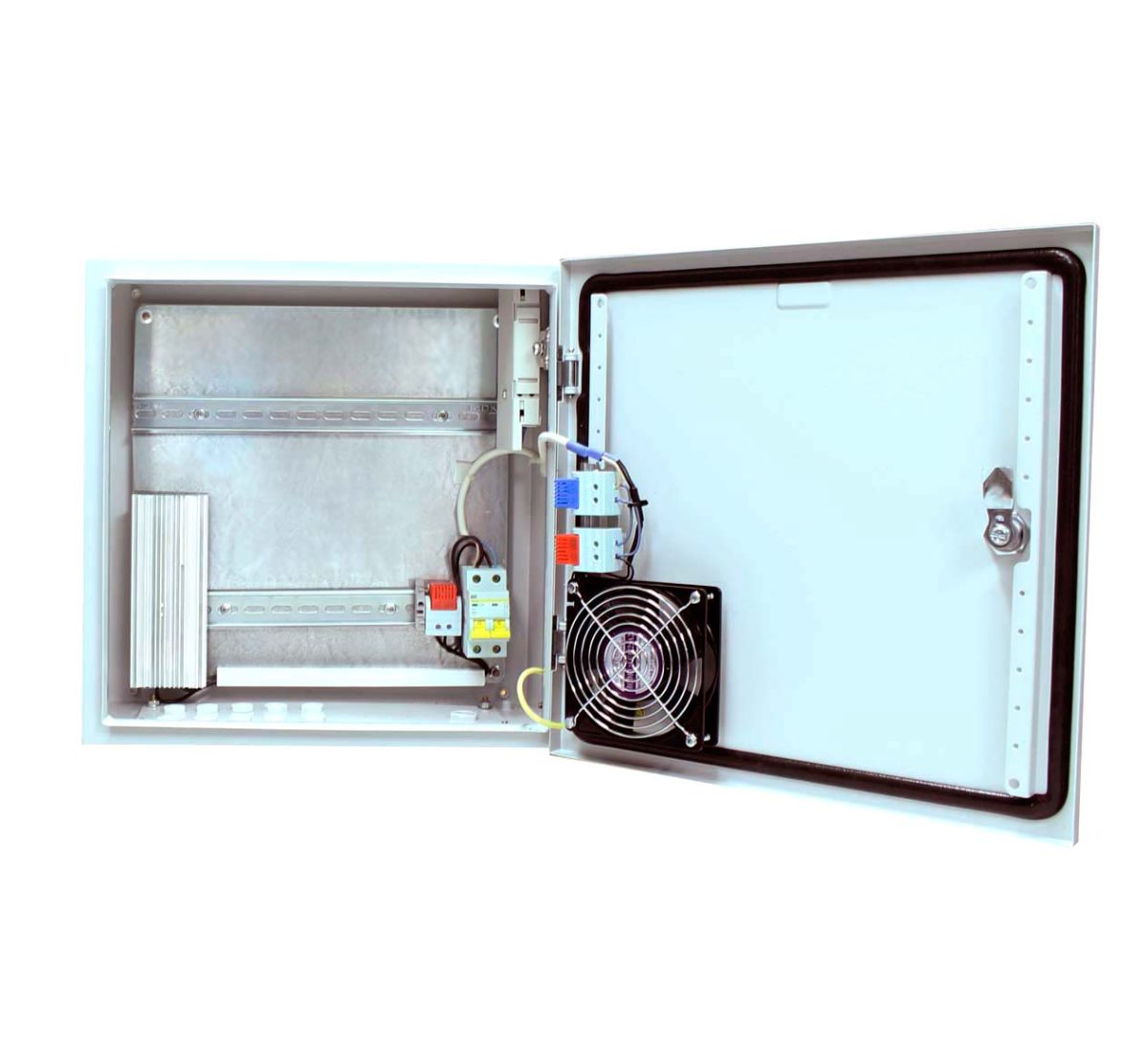 Уличная станция с оптическим кроссом + система обогрева : 2 разъема SC (ложемент 8 КДЗС, пигтейл оптический одномодовый SC 0,9мм длинна 1,5м 183x113x22мм); шкаф металлический; IP66, встроенные DIN-рейки: верхняя - 320мм, нижняя -180мм; набор гермовводов; автоматический выключатель 2P 220 В, 10A; обогреватель на DIN-рейке.AC 230 В, 100Вт; вентилятор 120x120x25 мм, AC 220В, 19Вт; -50…+50°С; 400x400x210 мм. Поддержание температуры внутри шкафа от-15 до +55°С (при изменении наружной температуры от -50... +50°С).