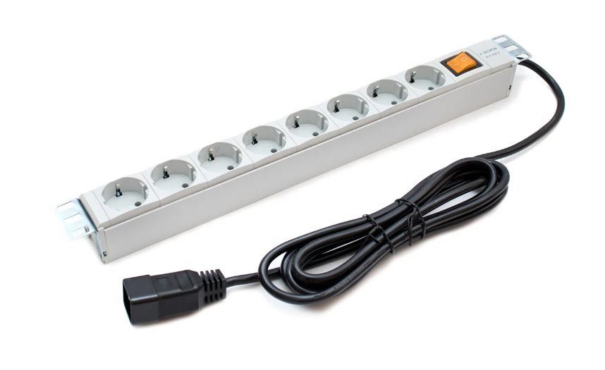 Розетки соединены в блок шинами электропитания и установлены в огнестойком пластмассовом корпусе высотой 1U.