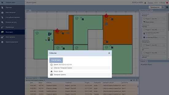Дополнительный модуль, работающий совместно со «Стандартным пакетом ПО». Предназначен для интеграции системы контроля доступа PERCo-Web с ИСО "Орион. Позволяет визуально мониторить состояние и управлять устройствами ОПС «Болид» в интерфейсе PERCo-Web (отображает охранные и пожарные зоны, разделы и реле на плане помещений), с возможностью задать реакций на события и управление устройствами системы PERCo-Web по событиям устройств ОПС «Болид» и устройствами «Болид» по событиям PERCo-Web.