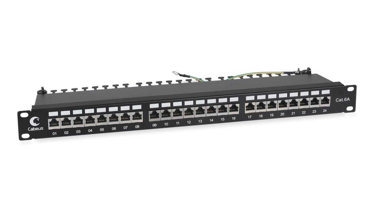 Патч-панель 19" (1U), 24 порта RJ-45, категория 6a, полностью экранированная, с задним кабельным организатором.