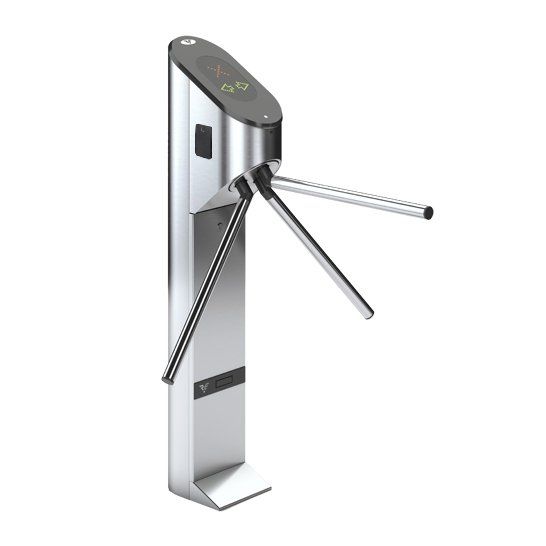 Турникет-трипод электромоторный, индикаторы прохода, пульт управления, планки и корпус из нержавеющей стали, встроенные считыватели формата Mifare 2 шт., крышка из полированного искусственного камня. Автоматическая функция «Антипаника», автоматическое раскладывание планок.
