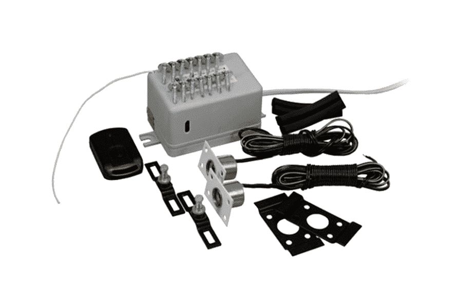 Promix-FRS.2D.01 Электромеханический замок с системой дистанционного управления для установки на ДВУдверные холодильные шкафы (KZBL-S1). Универсальная конструкция, подходит практически ко всем моделям шкафов. Состав комплекта: замок электромеханический (2 шт), кронштейн (2 шт), ригель (2 шт), самоклеющийся резиновый уплотнитель, контроллер дистанционного управления, радиобрелок, комплект крепежа, шнур для удлинения шнура противовеса, руководство по установке.