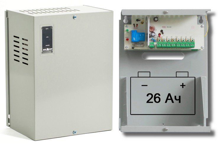 Резервированный источник питания; U-вх.150…250 В, U-вых.13.5…13.9 В, 8 каналов, I-вых.500 мА(на канал), I-вых.4 А(суммарный по каналам) + дополнительный выход на 4 А; под АКБ 12В 26 А·ч, tраб.0…+40°С, 210х285х150мм