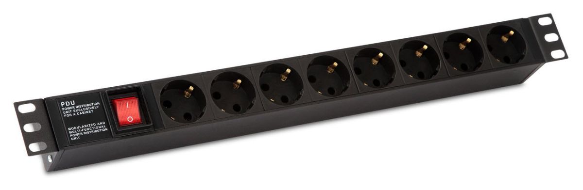 Блок розеток для 19" шкафов, горизонтальный, с выключателем с подсветкой, 6 розеток Schuko 10А, без кабеля питания, входная розетка IEC 320 C14, 482.6х44.4х44.4 мм.