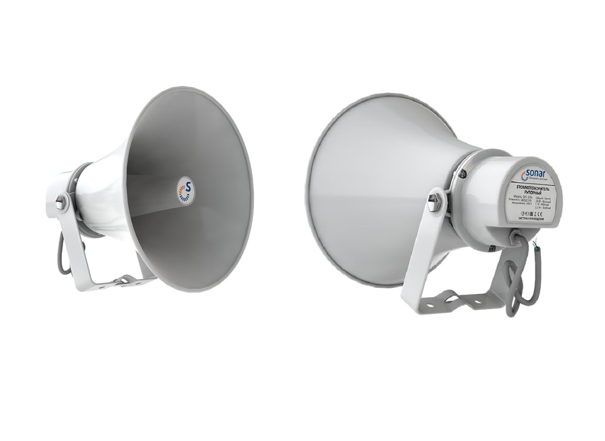 Громкоговоритель рупорный трансляционный, 100В, 10/5/2.5Вт, 350Hz-7kНz, 115 дБ, 208х263мм, 1.4кг, алюминиевый корпус.