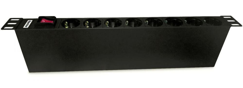 Блок розеток для 19" шкафов; Горизонтальный с выключателем с подсветкой; 8 розеток Schuko (10A), вилка IEC320 C14 на тыльной стороне; Кабель питания С13-С14; 3х1мм2, 3 м; Вилкой IEC320 C14 (10А); 482.6x116.0x44.4 мм. %Описание%
