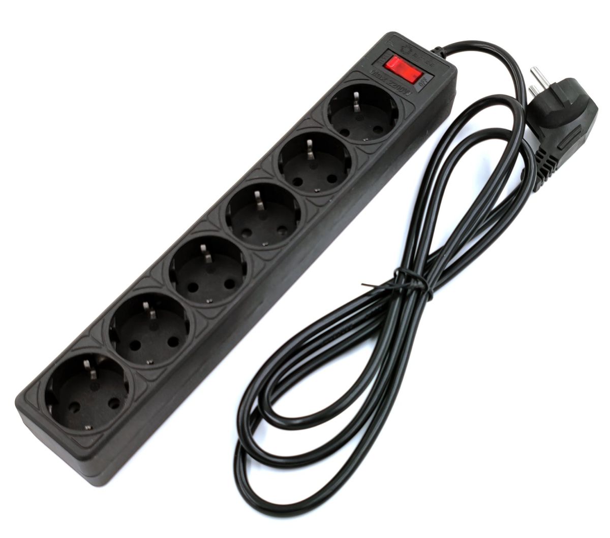 Сетевой фильтр с выключателем со световой индикацией, 6 розеток EURO, черный, 3х0.75 мм2, 2.2 кВт, 10А, 3 м.