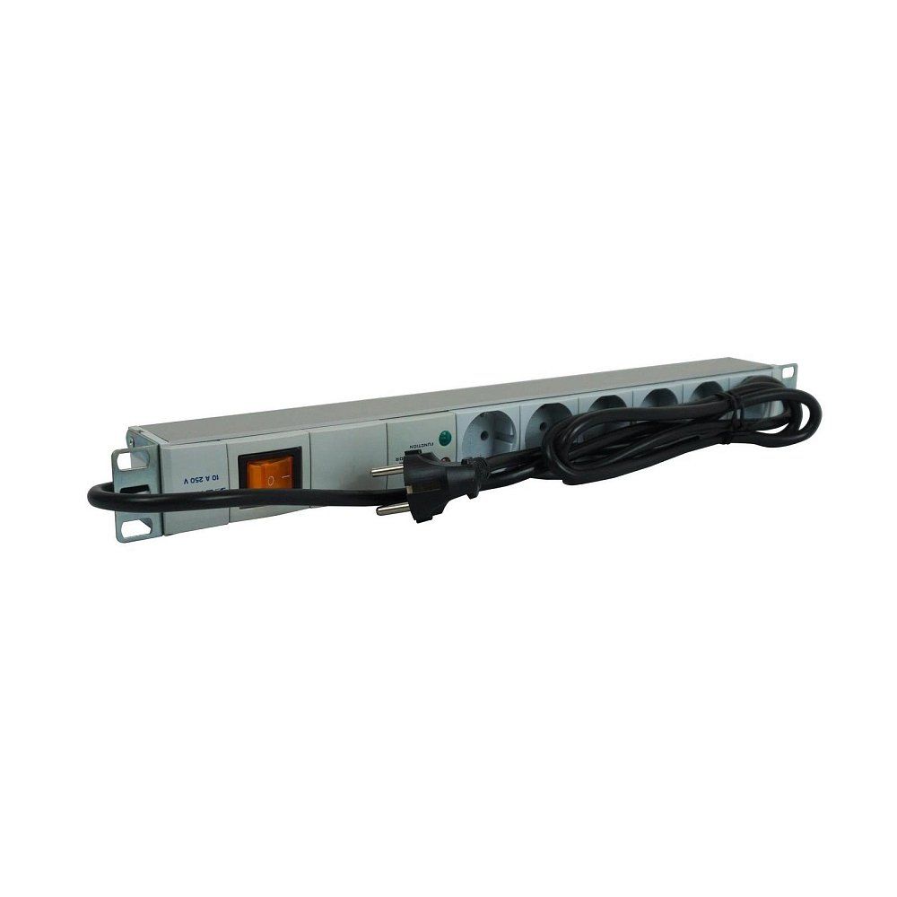 Блок электрических розеток для установки в 19" шкаф с сетевым фильтром-ограничителем перенапряжений и фильтром радиопомех, выключателем; высота 1U; 6 розеток (Shuko), кабель 3х1,5 мм², длина кабеля 1.8 м; U-вх.250 В, I-макс.16 А, 440х44.5х52 мм. Алюминиевый корпус.