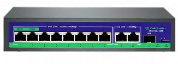Неуправляемый активный 10-портовый PoE-коммутатор, 8 х 10/100/1000 Мб/с PoE RJ45 (порты 1-8), 2 х 10/100/1000 Мб/с RJ45(порты 9-10) 1 Гб SFP(порт 11); бюджет PoE до 120 Вт, мощность на порт 30 Вт (макс.)