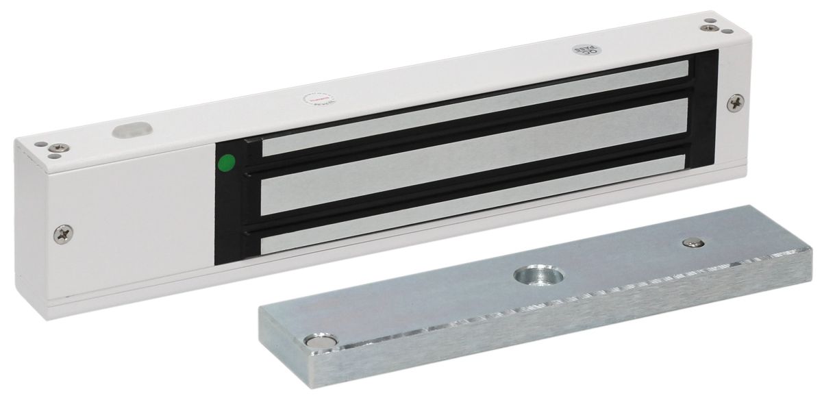 Электромагнитный замок силой удержания 320-340 кг, IP68, 12/24 В DC, 0,5/0,25 А, СИД (Красный/зеленый), датчик Холла, датчик положения двери, цвет белый, -40…+55°C, 261х49х29 мм.
