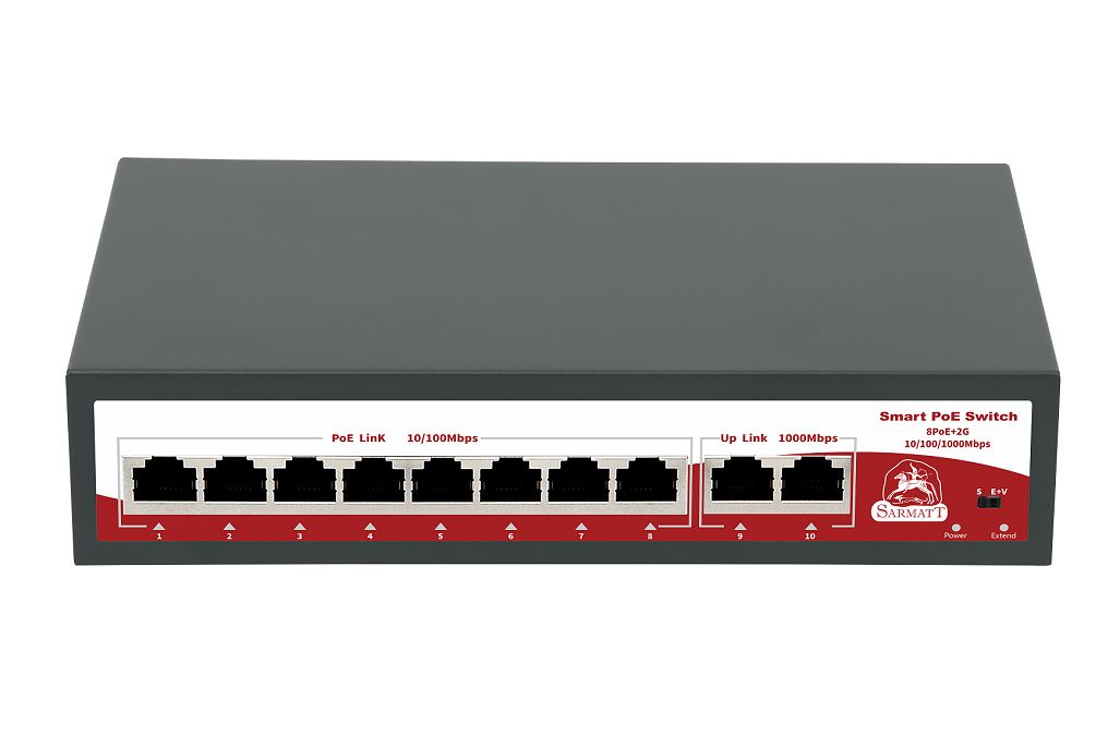 Коммутатор сетевой с РоЕ Gigabit Ethernet 10 портовый; 8 портов POE 10/100Mbps RJ-45 с поддержкой Auto-MDIX, IEEE 802.3af/IEEE 802.3at(до 30Вт), 2 порта 10/1000/Mbps RJ-45 Uplink; Суммарно до 120 Вт; АC 220В, 1,25A, 200х118х44 мм. Дальность передачи до 250 метров.