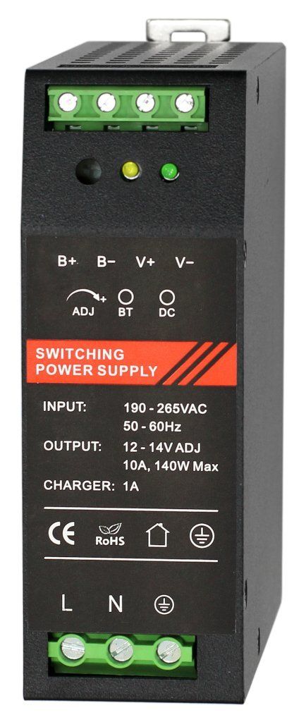 Резервированный источник питания с креплением на DIN-рейку; U-вх.190…265 В, U-вых.12…14 В (регулируемое), I-ном.10 А, I-max.11 А; I-зар.1 А; защита от короткого замыкания, защита аккумулятора от глубокого разряда; t-раб.-20…+50°C, 43х124х113 мм. Цвет черный.