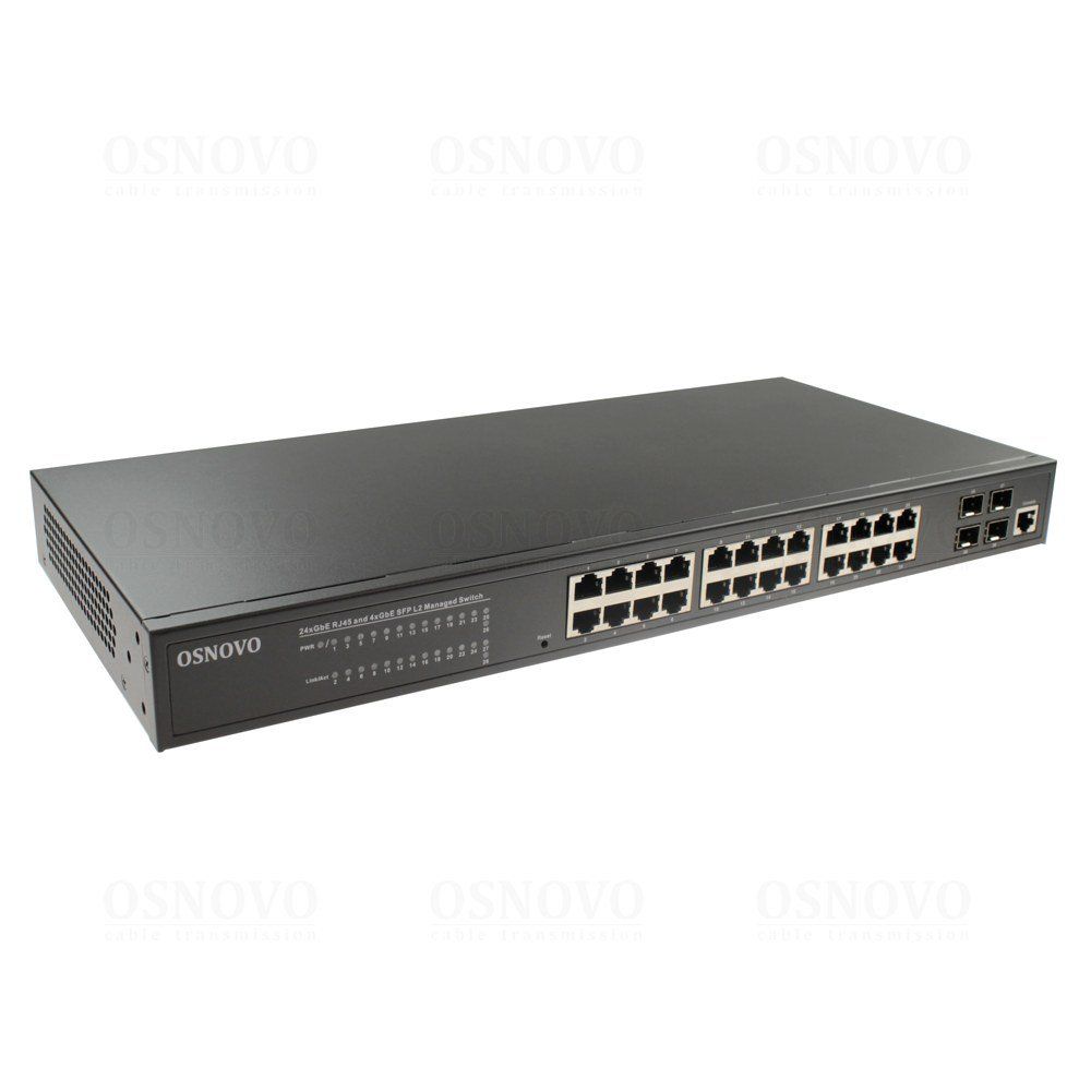 Коммутатор гигабитный управляемый L2+ 28 портовый; 24xRJ-45 10/100/1000 Мбит/с; Uplink 4xSFP+ 1G; консольный порт; IGMP Snooping, VLAN; встроенная грозозащита 6кВ на порт; топология: звезда, каскад, кольцо; AC 100-240 В; 25 Вт; 0…+40 С; 440х44х200 мм. Крепеж для 19" стойки в комплекте.