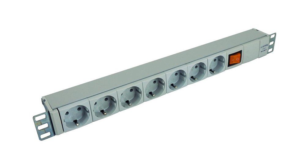 Блок электрических розеток для установки в 19" шкаф с выключателем; высота 1U; 7 розеток (SCHUKO, IEC320C13), 1 входной разъем IEC320; U-вх.220 В, I-макс.16 А; 440х44.5х52 мм. Алюминиевый корпус.