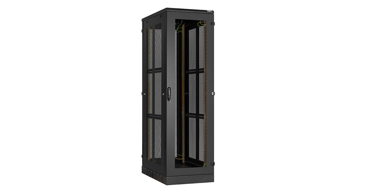Шкаф телекоммуникационный 19" напольный, 24U, передняя дверь стекло, боковые стенки и задняя дверь перфорированные, полезная глубина 900 мм, распределенная нагрузка 1100 кг, разборный, цвет черный, 1280х600х1000 мм.