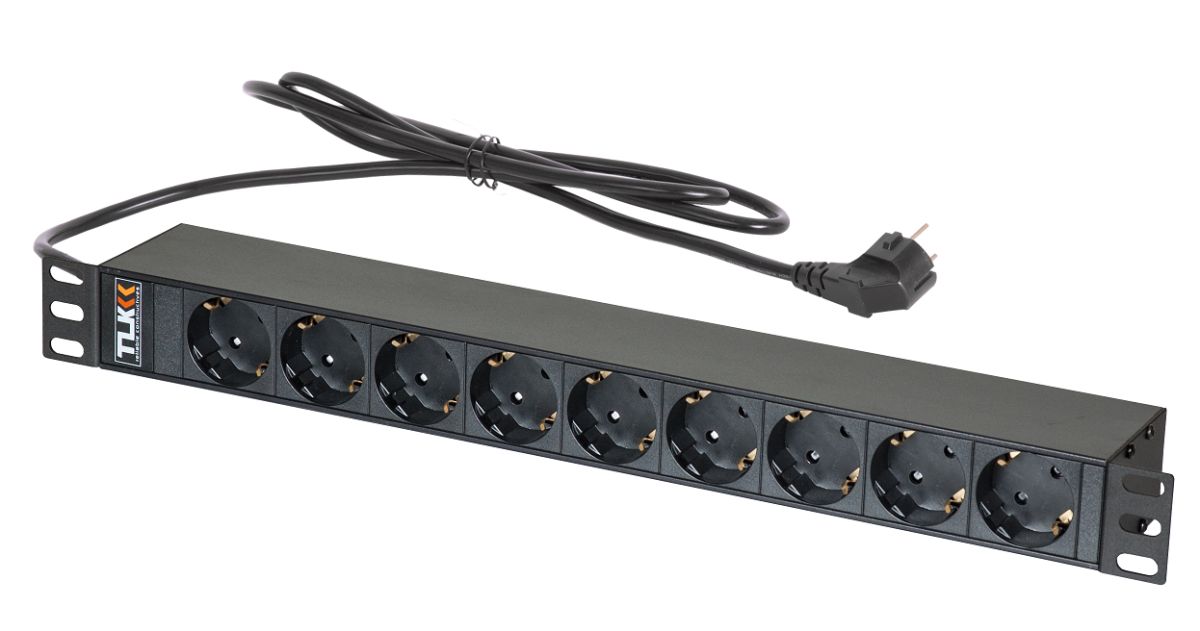 Блок электрических розеток TLK, 19", 9 гнезд "евророзетка", макс. нагрузка 16 А, шнур питания 1,8 метра, "евровилка", сечение 3*1,5 мм2, металлический корпус, макс. мощность 4000 Вт, Ш483хВ44хГ44 мм