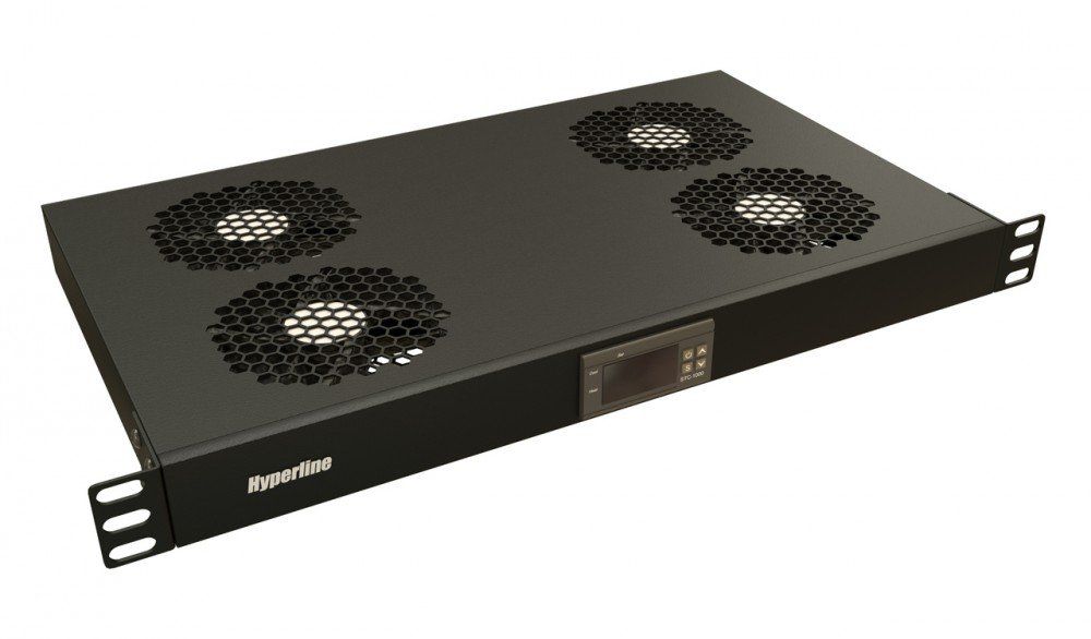 Модуль вентиляторный 19", 1U, глубиной 290мм, с термостатом и 4-я вентиляторами, номинальная мощность 70.40 Вт, датчик температуры с кабелем, кабель питания C13-Schuko 1.8м, цвет черный (RAL 9004).