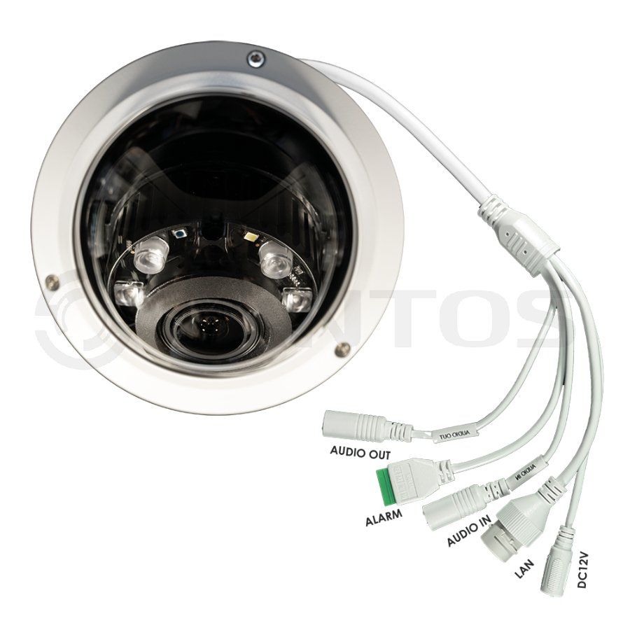 IP видеокамера уличная купольная антивандальная с ИК подсветкой, восьмимегапиксельная, 3840 x 2160, 1/2.8” сенсор 0.005 Люкс (день) / 0.001 Люкс (ночь) / 0 Люкс (с ИК подсветкой), технология iQSense, встроенная видеоаналитика, BLC, HLC, WDR, DNR, ROI, антитуман, Н.264+/H.265+, FTP, e-mail, моторизованный объектив 2.7-13.5 мм, механический ИК фильтр, DC 12V, PoE, встроенный микрофон, аудио вход/выход, вход/выход тревоги, microSD до 256Гб, герметичный разъем Ethernet, адаптивная ИК подсветка до 50м с раздельной регулировкой подсветки ближней и дальней зоны, белая тревожная подсветка до 10м, стробоскоп белого цвета, -40+60˚C, IP67, IK10, размеры Φ 142,2 × 116,5 мм.