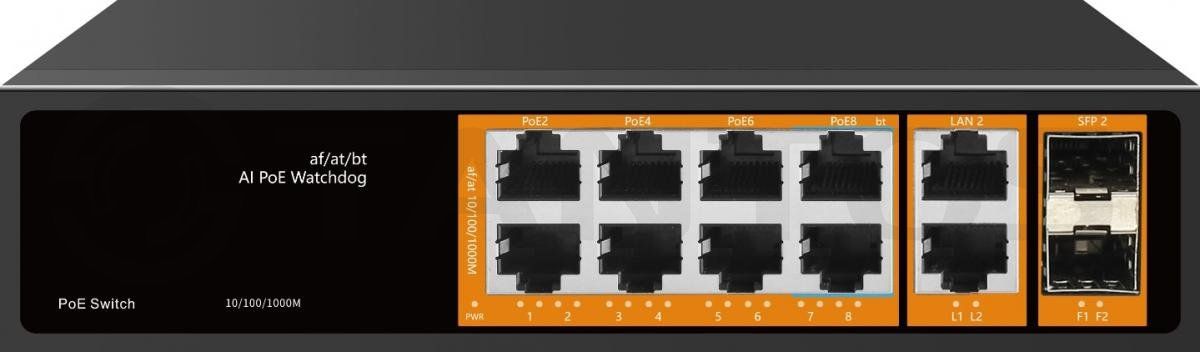 PoE коммутатор 8x1000 Мбит/с PoE портов (6 портов 802.3af/at, максимальная мощность PoE 30Вт на порт, 2 порта 802.3af/at/bt, максимальная мощность PoE 60Вт на порт) + 2x1000 Мбит/с порта Uplink, 2 порта SFP 1000Мбит/с, общий бюджет PoE120 Вт, автоматический PoE watchdog, встроенный блок питания, грозозащита и защита от статического электричества, от -30°С до +60°С. Возможность установки в 19” стойку с помощью монтажных комплектов TSn-MK1 и TSn-MK2.