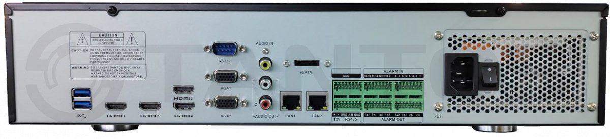 Сетевой 64 канальный H.265+/H.264+ регистратор для IP камер. Подключение и отображение 64 IP камер разрешением до 32 мегапикселей. Поддержка облачного сервиса vms2.tantos.pro (web, iPhone, Android). Одновременный просмотр, запись и работа с архивом. До 8 HDD по 22Тб каждый, RAID 0/1/5/10. Два порта 2500Мб Ethernet, 4 независимых HDMI (8К 7680×4320, 4К 3840×2160) / 2хVGA (1920×1080), eSATA, 16 входов / 8 выходов тревоги, RS-485, RS-232, вход / 2 выхода звука RCA. 2xUSB2.0, 2xUSB3.0, Мышь в комплекте. Синхронизация с FTP. Запись непрерывная, по расписанию, вручную, по тревожным событиям, по событиям видеоаналитики. Подключение сторонних IP камер по ONVIF и RTSP. Установка в стойку 19”