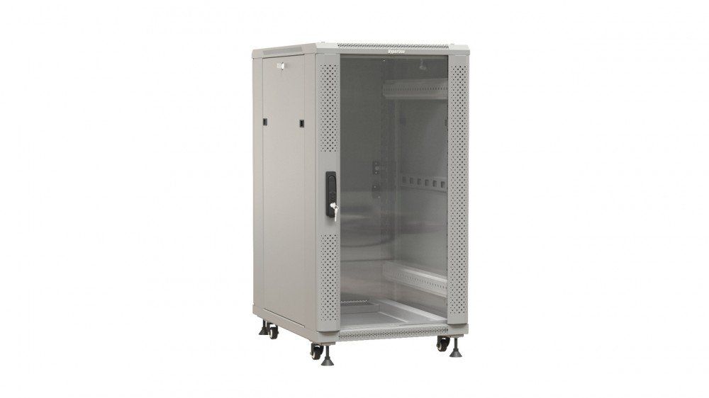Шкаф напольный 19'', 18U, передняя стеклянная дверь со стальными перфорированными боковинами, задняя дверь сплошная, ручка с замком, допустимая статическая нагрузка 1000 кг, полезная глубина 510 мм, цвет серый, разобранный, 988x600х600 мм