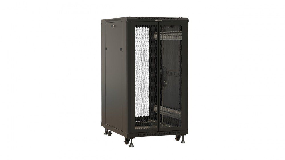 Шкаф напольный 19'', 27U, передняя и задняя распашные перфорированные двери (75%), ручка с замком, допустимая статическая нагрузка 1000 кг, полезная глубина 910 мм, цвет чёрный, разобранный, 1388x600х1000 мм.