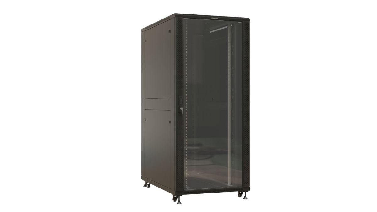 Шкаф телекоммуникационный 19", напольный, 32U, дверь передняя стеклянная со стальными перфорированными боковинами, дверь задняя металл, ручка с замком, 2 вертикальных кабельных организатора, полезная глубина 710 мм, распределенная нагрузка 1000 кг, цвет черный, разобранный, 1610х800x800 мм.