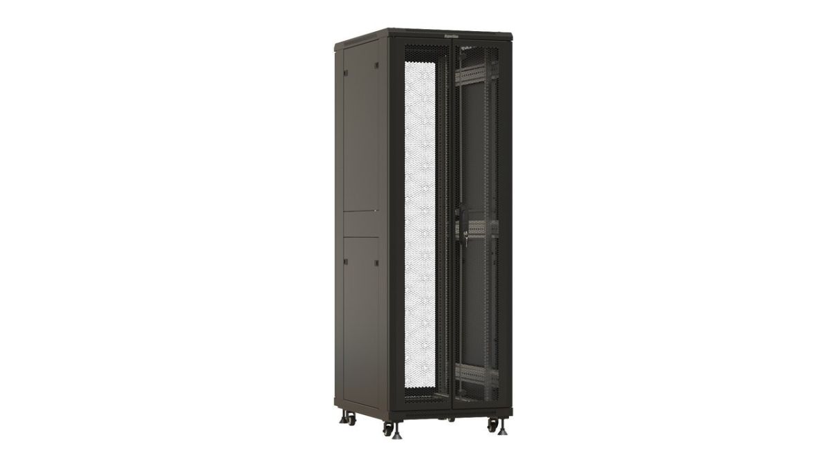 Шкаф напольный 19'', 42U, передняя и задняя распашные перфорированные двери (75%), ручка с замком, допустимая статическая нагрузка 1000 кг, полезная глубина 1110 мм, цвет чёрный, разобранный, 2055x600х1200 мм.