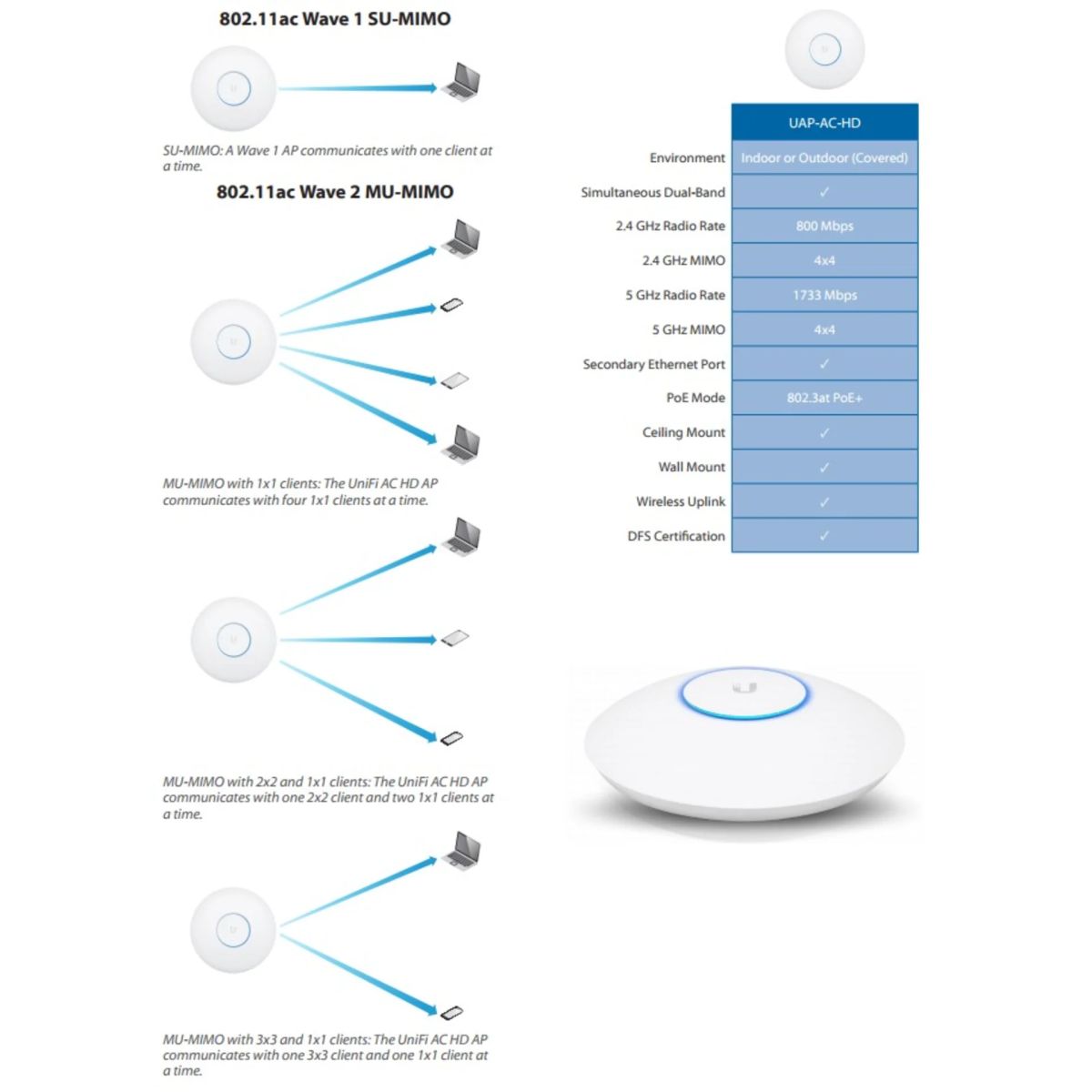 UniFi AP AC HD - это первая точка доступа UniFi, работающая с применением технологии 802.11AC Wave 2. Сочетая в себе увеличение производительности благодаря MU-MIMO и использование пространственных потоков 4х4, устройство обеспечивает до 125% более высокие результаты по сравнению с обычной точкой доступа Wave 1. UAP-AC-HD предназначен для установки в зонах с высокой плотностью клиентов, где требуется максимальная производительность. Точка доступа может одновременно работать в двух диапазонах по технологии 4x4 MU-MIMO.