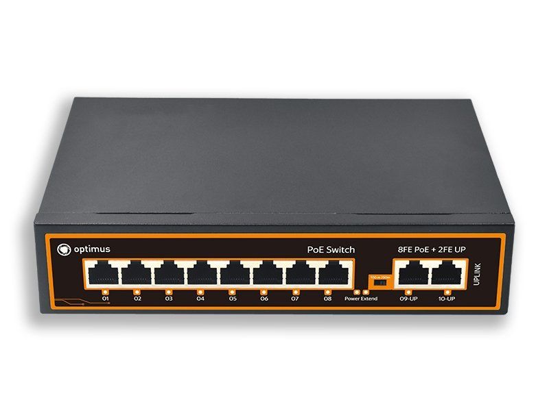 Коммутатор сетевой 10 портовый неуправляемый c PoE; 8xRJ-45 PoE 10/100 Мбит/с (PoE+), IEEE 802.3af/at; 2xRJ-45 Uplink 10/100 Мбит/с; PoE бюджет 60 Вт при DC 12 (120 Вт при DC 24В), БП в комплект не входит; -30... +50°C; 204х144х44 мм.