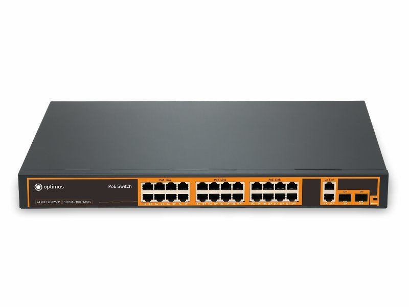 Коммутатор сетевой 28 портовый неуправляемый c PoE; 24xRJ-45 PoE 10/100/1000 Мбит/с (PoE+), IEEE 802.3af/at; 2xRJ-45 (комбинированные с SFP) Uplink 10/100/1000 Мбит/с; PoE бюджет 400 Вт; AC 220В; -30... +55°C; 204х144х44 мм.