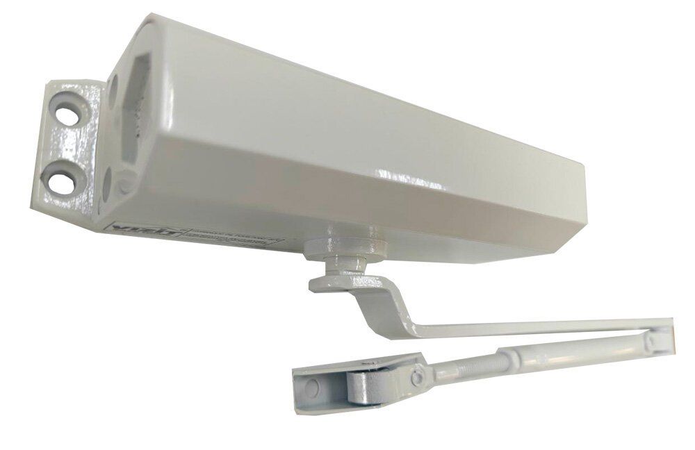 Доводчик дверной для двери весом до 80 кг, рычаг с квадратным отверстием. Монтажные размеры 165х19 мм. Температура застывания гидравлической жидкости: -60°C, рабочий диапазон -50...+60°C. Цвет: белый.