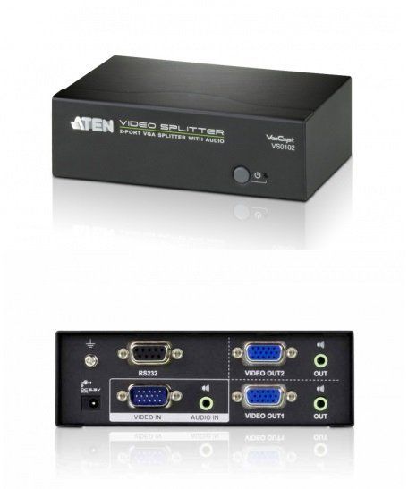 Разветвитель Video Splitter, VGA/SVGA/MultiSync+AUDIO, 1> 2 монитора/port 450MГц, до 65 м, без шнуров, БП в комплекте, DC 5.3В, 0.8 Вт, 0…+50°C, 130х76х44 мм.