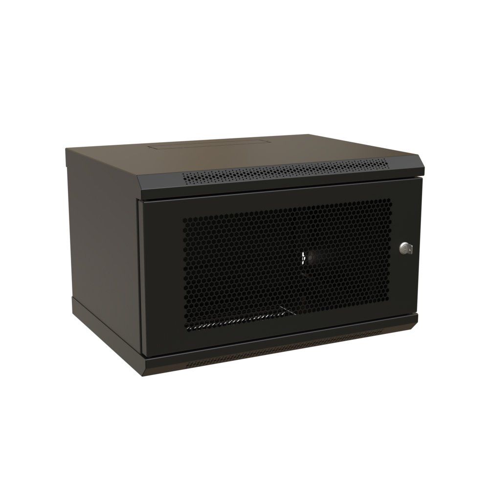 Шкаф настенный 19-дюймовый, 9U, полезная глубина 370 мм, перфорированная металлическая дверь с замком, цвет черный, разобранный, допустимая статическая нагрузка 60 кг, 500x600х450 мм.