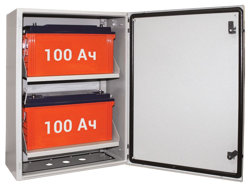 Аккумуляторный отсек уличного исполнения, под два аккумулятора 12 В / 100…120 Ач, степень защиты оболочкой IP65, диапазон рабочих температур -40…+40°С, габаритные размеры 410х200х280 мм, 12,5 кг
