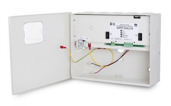 Резервированный источник питания трансформаторный; U-вх.187…242 В, U-вых.пост. 24±0,24 В, I-номин. 2,5 А, I-max. 2.7 А (кратковр.), под два аккумулятора 12 В 12 А·ч (последов.), свет. индик. режимов работы, выходы оптореле "Контроль Сети", "Контроль батареи", "Контроль выхода", "Тампер", электронная защита от КЗ, защита АКБ от глубокого разряда, IP30, t-раб. -10…+40°С, 320×250×115 мм. Металлический корпус