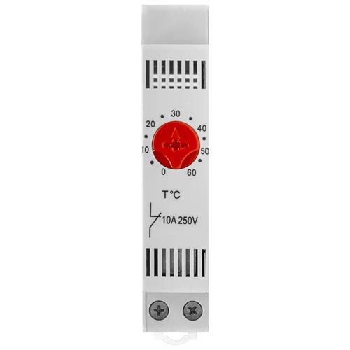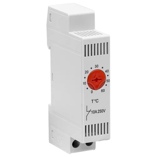 Термостат предназначен для регулировки температурного режима внутри шкафа, позволяя задавать верхние и нижние пороги температуры в диапазоне от 0 до 60 °C; гистерезис 7 °C. Модуль термостата крепится к DIN-рейке и имеет компактные размеры