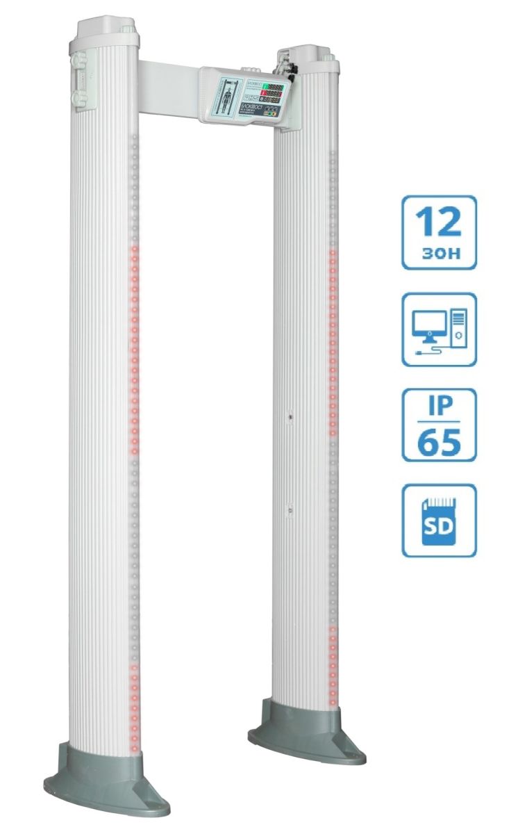Всепогодное исполнение; 12 зон; проход 720 мм; 60 чел/мин; уровни чувствительности – 100 общих/400 каждой зоны; обнаружение металла от 10г; магнитные и немагнитные металлы; световая и звуковая индикации; счетчик проходов; параллельная эксплуатация – до 50 устройств на расстоянии от 50 см; повышенная помехоустойчивость; выход реле (работает при тревоге); хранение событий на SD-карте; подключение к ПК; пульт ДУ. AC 220 В (не более 12 Вт). –20...+60°C. IP65. 2230х1130х490 мм. Кабель питания – 5м.