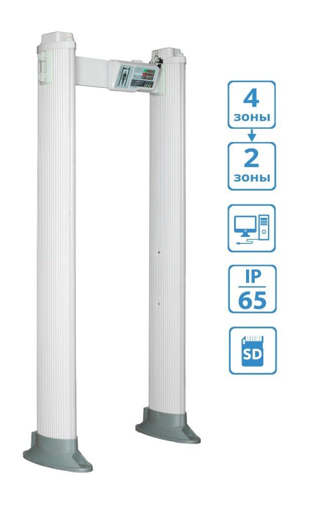 4/2-зонный арочный металлодетектор. Сверхпрочный с уровнем пылевлагозащиты IP-65. Оснащен новейшей функцией - регистратором событий с SD-card. Наличие «сухих контактов», счетчика проходов, а также три способа подключения к сети (справа, слева, сверху). Безвреден для человеческого организма. обладает возможностью использования до 8 единиц при параллельной эксплуатации на расстоянии от 5 см друг от друга, 2230х1130х300 мм.