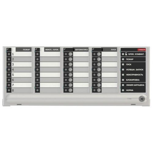 - 4 индикатора на одну зону: "ПОЖАР", "НЕИСП./БЛОК", "АВТОМАТИКА", "ПУСК";