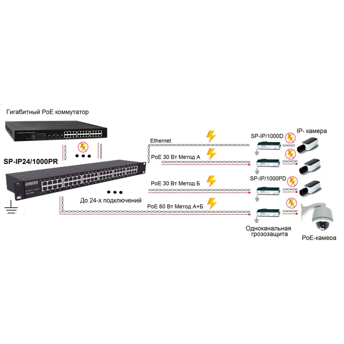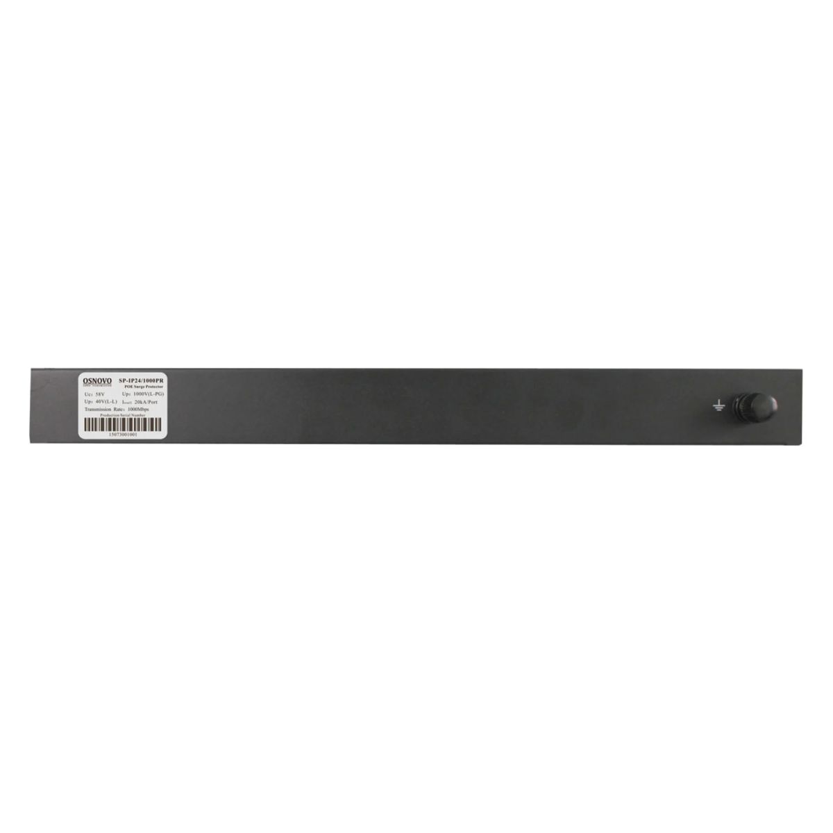 1U устройство грозозащиты для локальной вычислительной сети на 24 порта (скорость до 1000 Мб/с) с защитой линий PoE (af/at, методы A + B, контакты 1/2, 3/6, 4/5, 7/8).