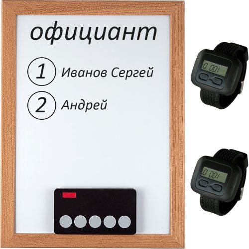 Комплект включает в себя: влагозащищенную кнопку вызова iBells 350, 2 наручных пейджера официанта iBells 203 и маркерную доску.