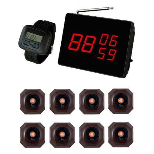 Комплект включает в себя: табло вызова iBells 108, пейджер iBells 203 и 8 кнопок вызова iBells 301 (кофе).