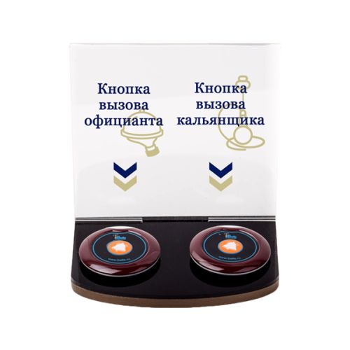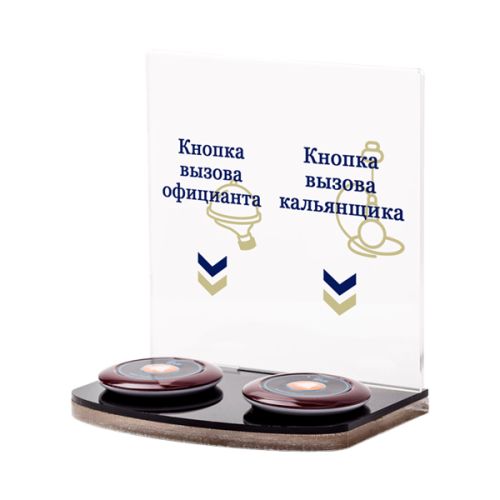 Разместив две кнопки, у гостей появится возможность вызвать разных сотрудников: официанта и кальянщика. На вставке-холдере можно разместить любую рекламную информацию.