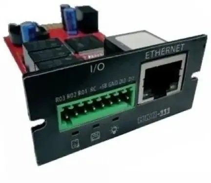 SNMP-карта предназначена для мониторинга состояния и управления ИБП по ЛВС или интернет; мониторинг, управление и конфигурация осуществляются через встроенный WEB-интерфейс, TelNet или считывание вектора состояния с помощью JSON; 1xRJ-45; RS-232; SSH, SNMP v1, v2, Telnet; 60х70х45 мм