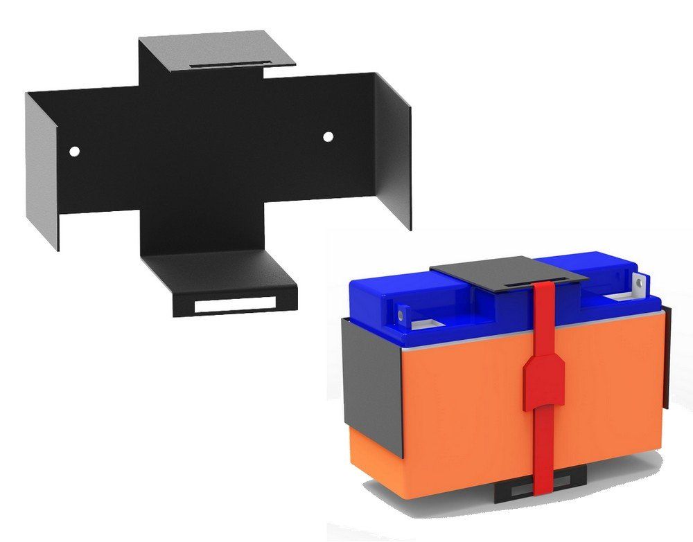 Полка для аккумуляторной батареи емкостью 7 или 9 А·ч. Внешние габариты полки c учетом крепления (ШхВхГ): 155х96х67 мм. Установочные габариты не более (ШхВхГ): 152х95х65 мм. Материал — листовая сталь толщиной 1 мм. Цвет чёрный (RAL 9005). Кабельная стяжка Велькро в комплекте.