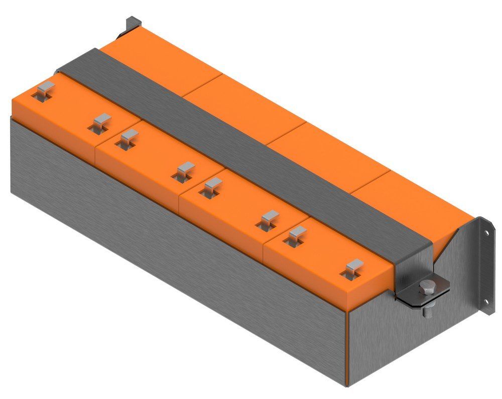 Полка для 4 аккумуляторных батарей емкостью 12 А·ч. Внешние габариты полки c учетом крепления (ШхВхГ): 448х100х158 мм. Установочные габариты не более (ШхВхГ): 198х96х154 мм. Материал — листовая сталь толщиной 2 мм. Цвет чёрный (RAL 9005).