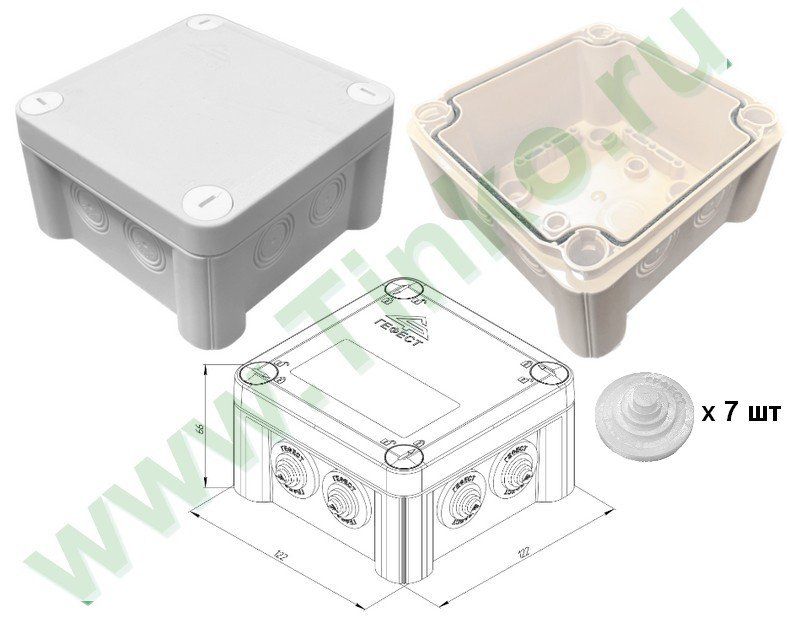 Коробка монтажная пластиковая, стойкая к УФ; 7 ступенчатых мембранных вводов (устанавливаются самостоятельно в удаляемые профили); У1, IP55, t-раб. -40…+80°С, габ.размеры 122х122х66 мм , цвет серый.
