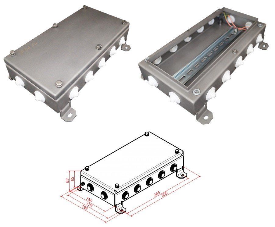 Коробка монтажная с DIN-рейкой Ω-типа шириной 35 мм и высотой 7.5 мм, 14 вводов, IP55, t-раб.-40…+60°C, габ.размеры 150х300х60 мм, вес 1.86кг, нержавеющая сталь