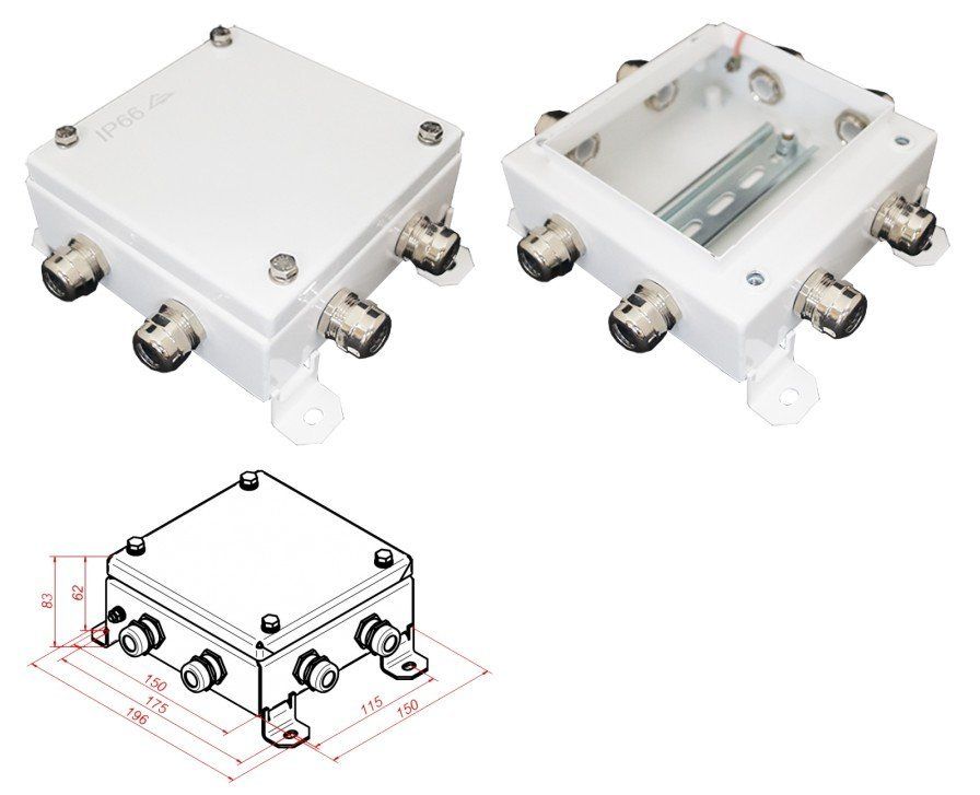 Коробка монтажная с DIN-рейкой Ω-типа шириной 35 мм и высотой 7.5 мм, 8 вводов, IP66, tраб.-40…+60°С, габ.размеры 150х150х60 мм, вес 1.45кг, оцинкованная сталь с полимерной окраской
